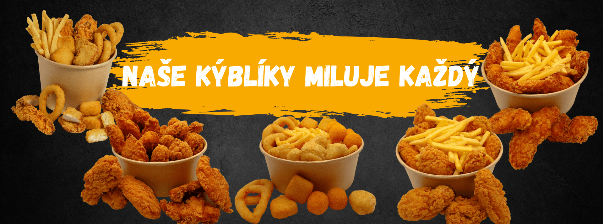 kuřecí stripsy ( 3x ), pikantní kuřecí křidýlka ( 3x ), kuřecí nugetky ( 3x ), mini sýry ( 3x ), cibulové kroužky ( 3x ), hranolky